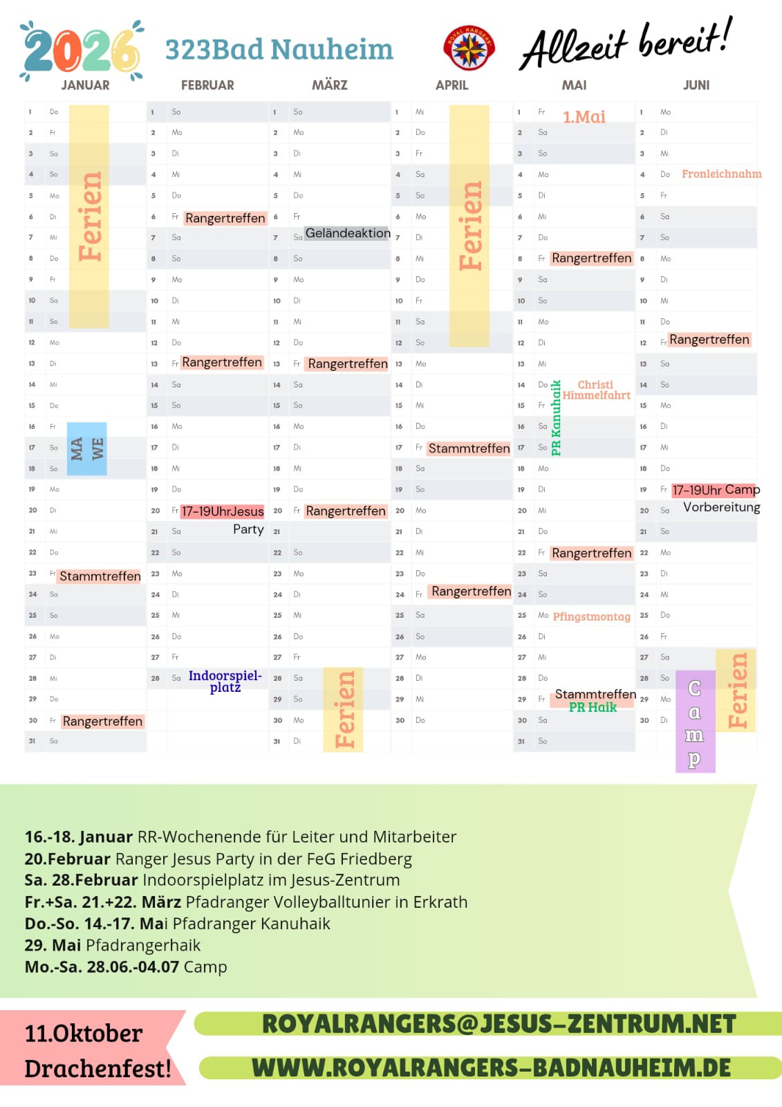 Hier findest du unseren Jahresplan für das nächste Halbjahr zum downloaden. Es können sich jedoch trotzdem immer wieder kurzfristig Termine ändern - dann bekommst du natürlich eine Info. Außerdem werden alle Änderungen auf der Royal Ranger-Startseite unter Termine angezeigt.